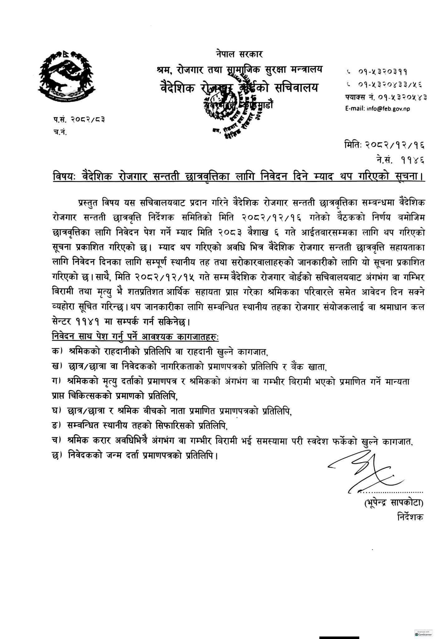 वैदेशिक रोजगार सन्तति छात्रवृत्तिका लागि निवेदन दिने म्याद थप गरिएको सूचना !!